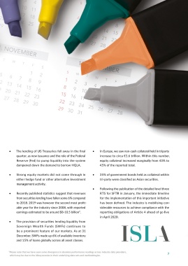 • As at 31 December 2019, reported global on-loan • Government bond lending represented circa 46% • The lending of US Treasuries fell away in the final • In Europe, we saw non-cash collateral held in triparty